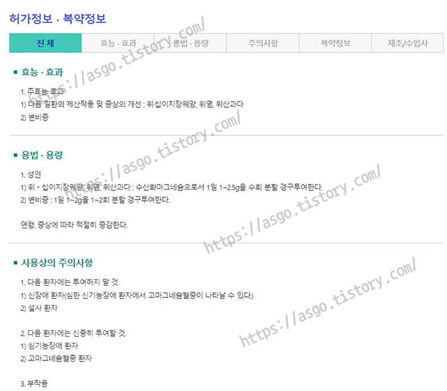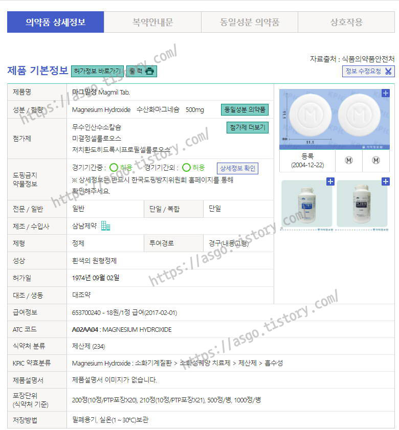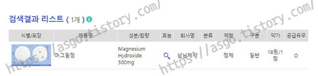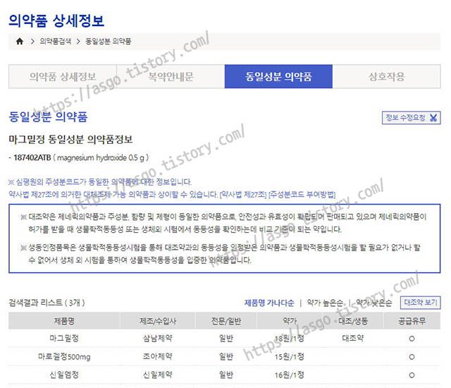 제가 검색한 마그밀정과 동일한 성분의 약이 두가지가 더 있습니다.