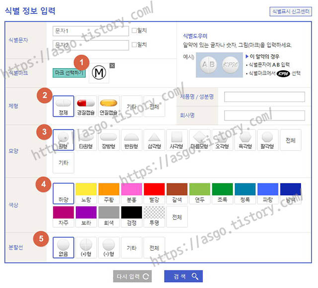 약에 쓰여있는 문자 또는 마크, 제형, 모양, 색상, 분할선 등의 정보를 가지고 검색을 할 수 있습니다.