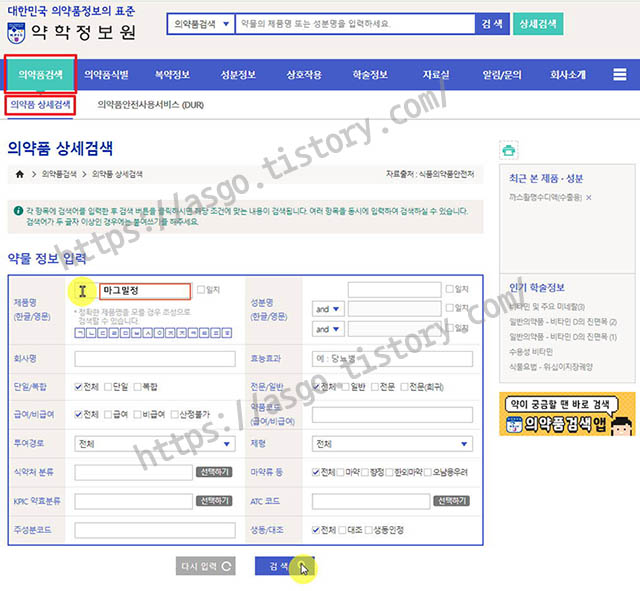 의약품 검색 > 의약품 상세검색 메뉴로 들어가서 제품명 / 회사명 등 현재 알 수 있는 정보를 최대한 입력해줍니다.