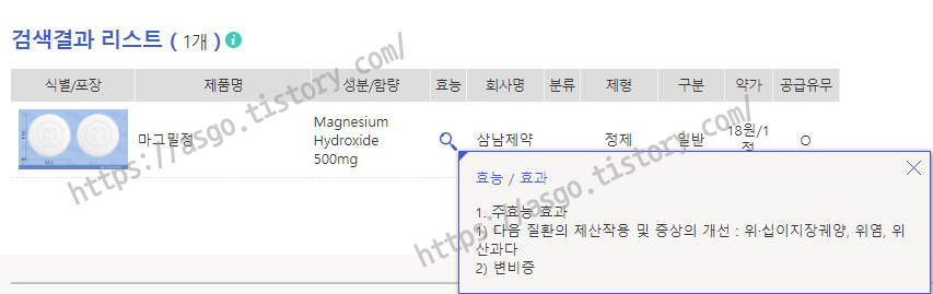 효능 컬럼의 돋보기 모양을 클릭하시면 약의 효과를 볼 수 있는 팝업레이어창이 나타납니다.