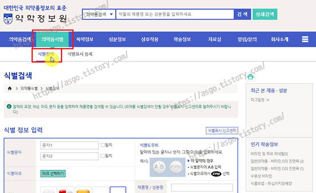 상단 메뉴에서 의약품식별 > 식별검색 메뉴를 선택합니다.